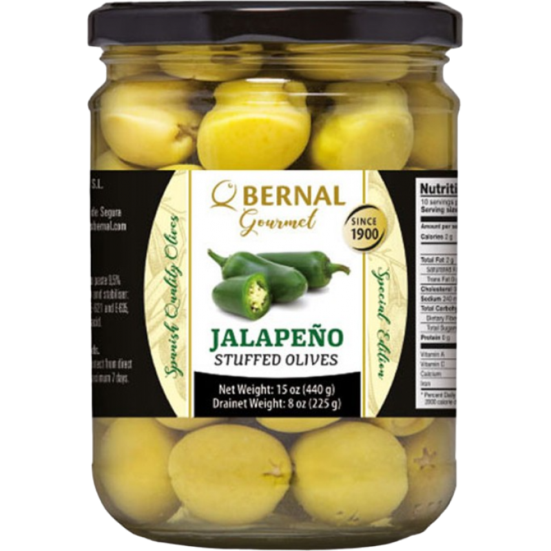 Зеленые оливки среднего размера, фаршированные острым перцем Халапеньо — мексиканским вариантом жгучего перца чили. Эти пикантные оливки могут использоваться в качестве самостоятельного аперитива, а также для приготовления самых разнообразных мясных и рыбных блюд, салатов и пиццы.